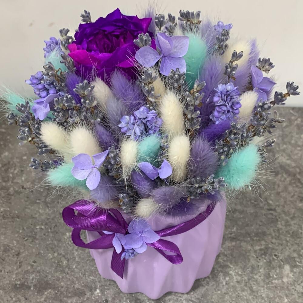 Ваза – 1 шт.Роза стабилизированная – 1 шт.Лаванда (сухоцвет) – 20 шт.Лагурус (сухоцвет) – 25 шт.гортензия стабилизированная – 1 шт.