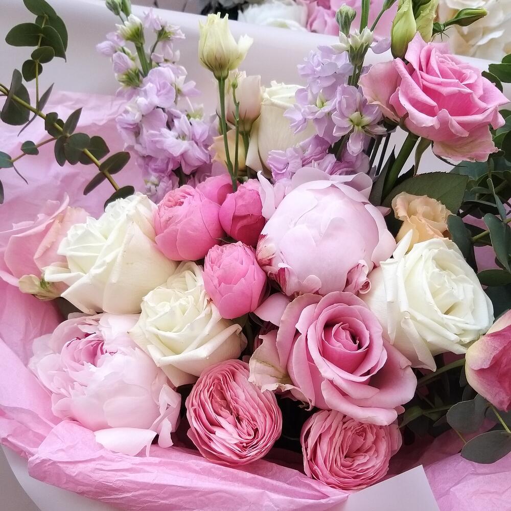 пионовидная роза кустовая Misty Bubbles – 2 шт.Пион – 2 шт.Роза белая – 4 шт.Маттиола – 2 шт.Роза розовая – 3 шт.Лизиантус розовый – 1 шт.Эвкалипт – 3 шт.