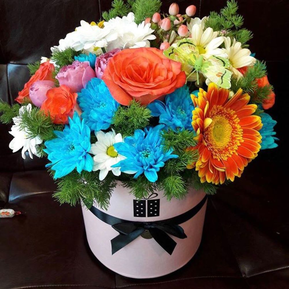 Хризантема кустовая – 4 шт. Зелень – 3 шт. Гербера – 1 шт. Шляпная коробка – 1 шт. Роза кустовая пионовидная – 1 шт. Роза одноголовая местная 50 см – 4 шт.