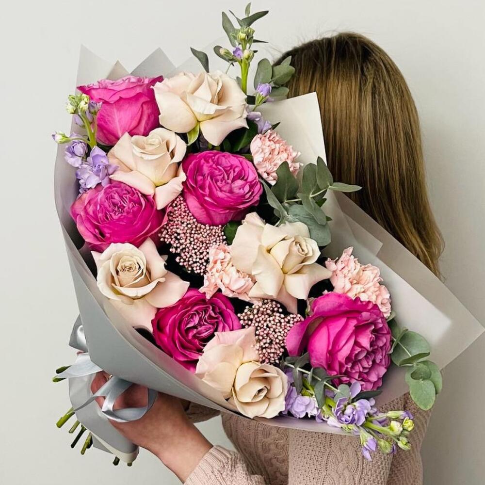 Роза Эквадор – 5 шт.Роза – 6 шт.Озотамнус – 2 шт.Диантус – 3 шт.Маттиола – 3 шт.Эвкалипт – 3 шт.Упаковка дизайнерская – 3 шт.