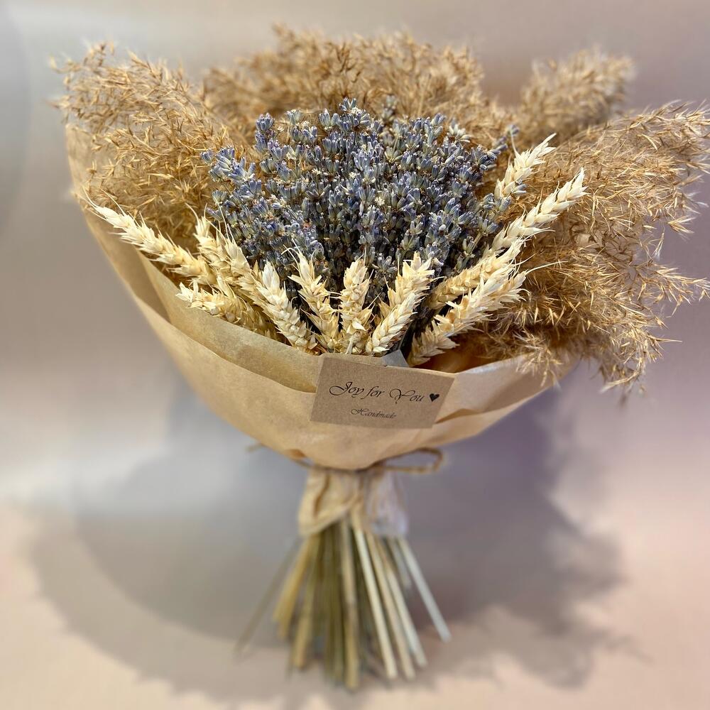 Лаванда (сухоцвет) – 1 шт.Пшеница (сухоцвет) – 15 шт.Дизайнерская упаковка – 1 шт.пампасная трава – 4 шт.