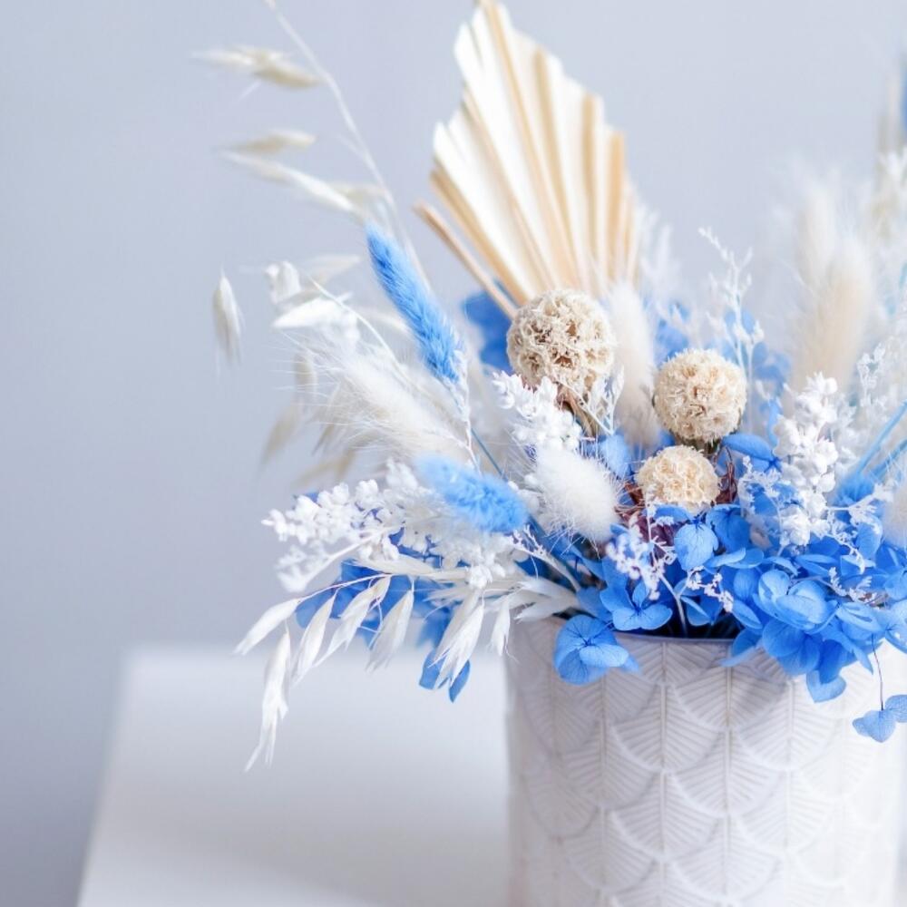 Упаковка дизайнерская – 1 шт.Лагурус – 2 шт.Скабиоза сухая – 3 шт.гортензия стабилизированная – 1 шт.сорго – 1 шт.мох ягель стабилизированный – 1 шт.лимониум стабилизированный – 1 шт.дикий овес – 1 шт.лист пальмы копье – 1 шт.кашпо керамическое д10 – 1 шт.