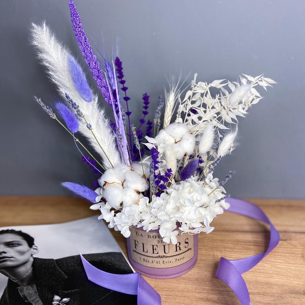 Лаванда (сухоцвет) – 7 шт.Колоски пшеницы – 2 шт.Хлопок натуральный – 3 шт.Лагурус (сухоцвет) – 7 шт.камыш декоративный – 1 шт.иглица крашенная – 1 шт.гортензия белая стабилизированная – 1 шт.банка жестяная – 1 шт.сетария сухоцвет – 1 шт.шандра стабилизированная – 2 шт.