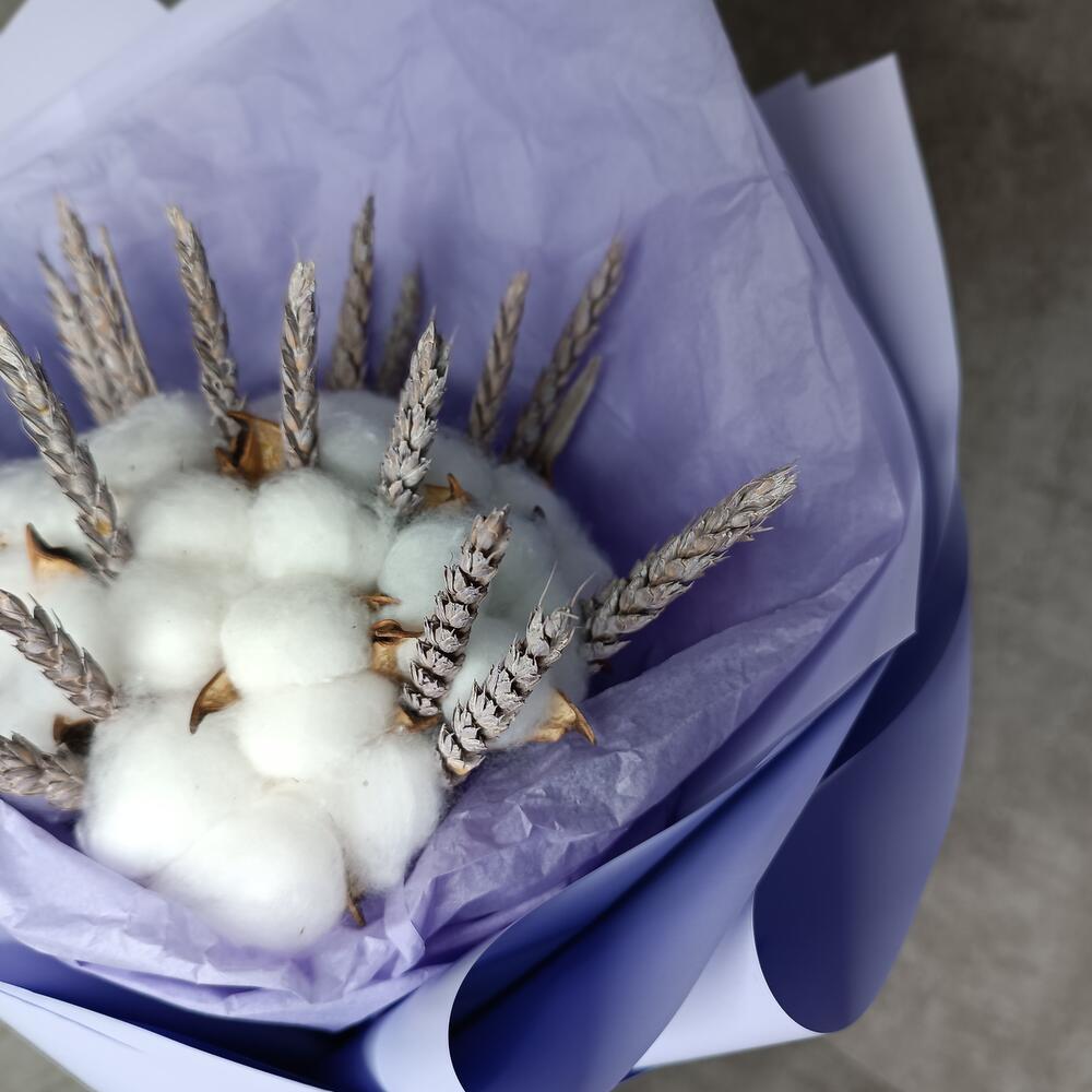 Хлопок – 9 шт.Лента атласная – 2 шт.Кружево – 1 шт.Корейская пленка – 2 шт.Тритикум(пшеница) – 16 шт.Бумага тишью – 1 шт.