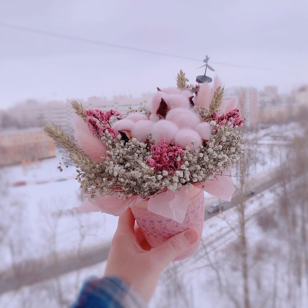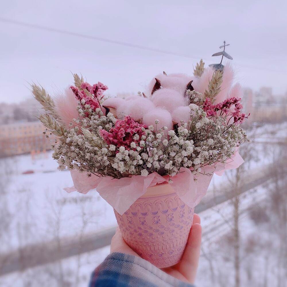Очаровательная композиция из сухоцветов и стабилизированных растений в кашпо из керамики.Собрана в нежных тонах.Сухоцветы – необычный подарок, который удивит своей невероятной стойкостью (от года и более) при правильном и простом уходе.- Ставить в сухую вазу без воды, избегать влажности. – Держать букетик вдали от прямых солнечных лучей и отопительных приборов.Почему выбирают нас? – Работаем на качество. – Бережно упакуем в транспортировочную пленку, чтобы защитить во время доставки от любых погодных условий. – Приложим инструкцию, как правильно ухажи