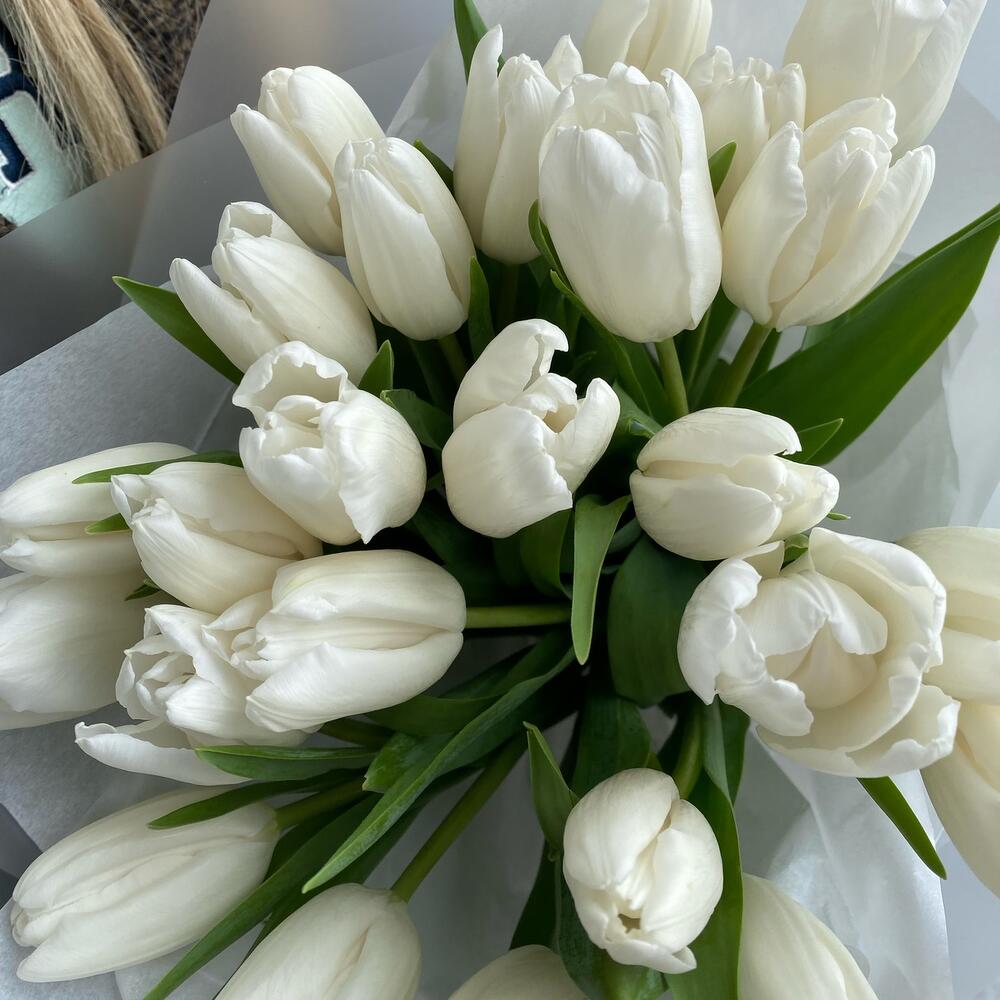 Лента атласная – 2 шт.Тишью – 2 шт.Упаковка дизайнерская – 4 шт.тюльпаны белые – 25 шт.