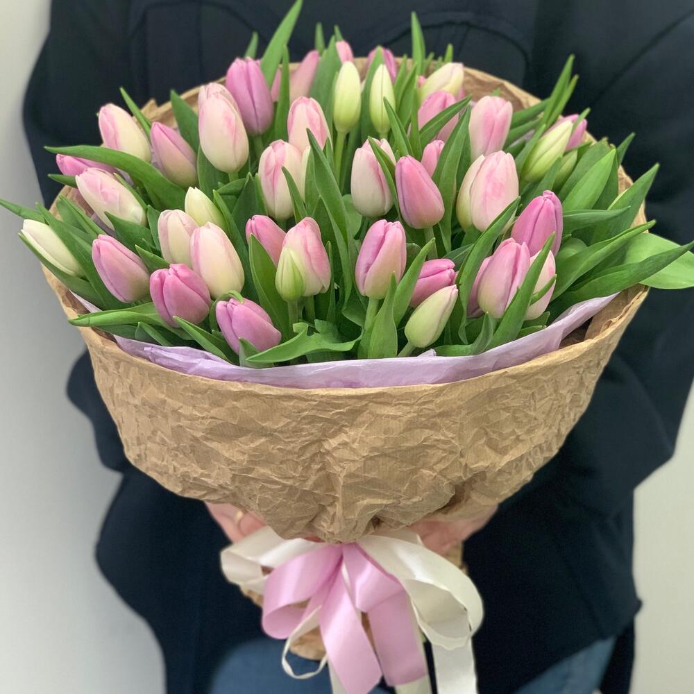 Тюльпан – 51 шт.Дизайнерская упаковка – 2 шт.Атласная лента – 1 шт.