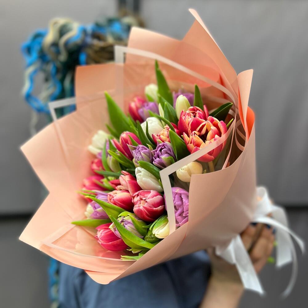 Тюльпан пионовидный – 20 шт.Тюльпан белый – 9 шт.Пленка матовая – 5 шт.Лента атласная – 2 шт.