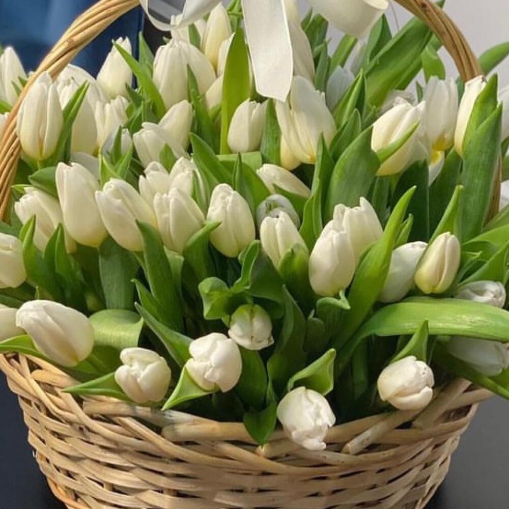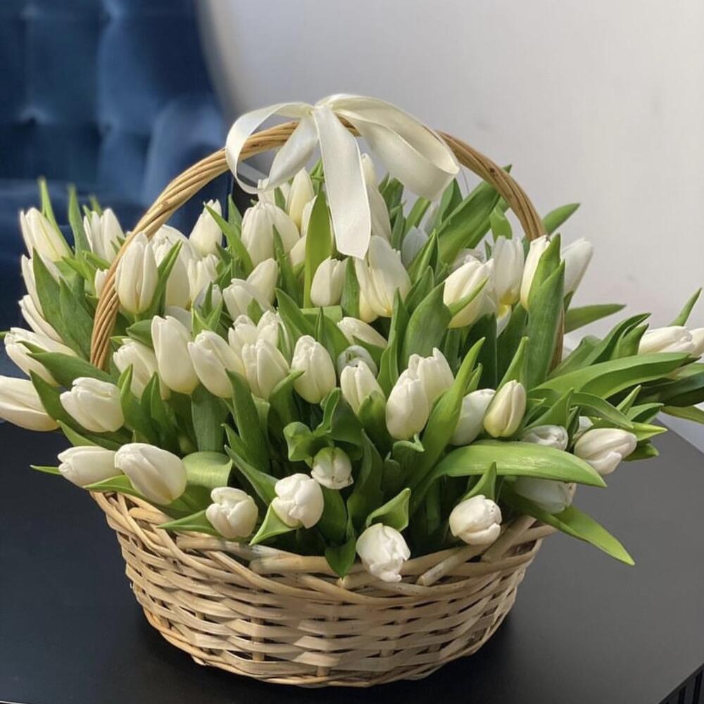 тюльпаны белые – 51 шт.Корзина плетеная – 1 шт.Лента атласная – 1 шт.Открытка – 1 шт.хорошее настроение – 100 шт.инструкция по уходу за цветами – 1 шт.Кризал – 1 шт.