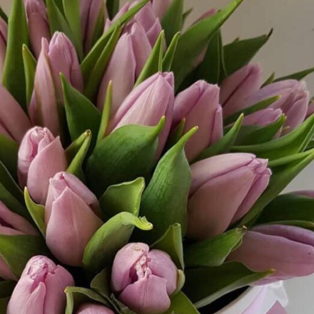 Тюльпан розовый – 51 шт.Коробка шляпная – 1 шт.Лента атласная – 2 шт.Открыточка с вашими пожеланиями – 1 шт.хорошее настроение – 100 шт.инструкция по уходу за цветами – 1 шт.Кризал – 1 шт.