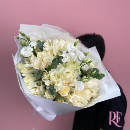 Букет “70” из белой розы с эвкалиптом
